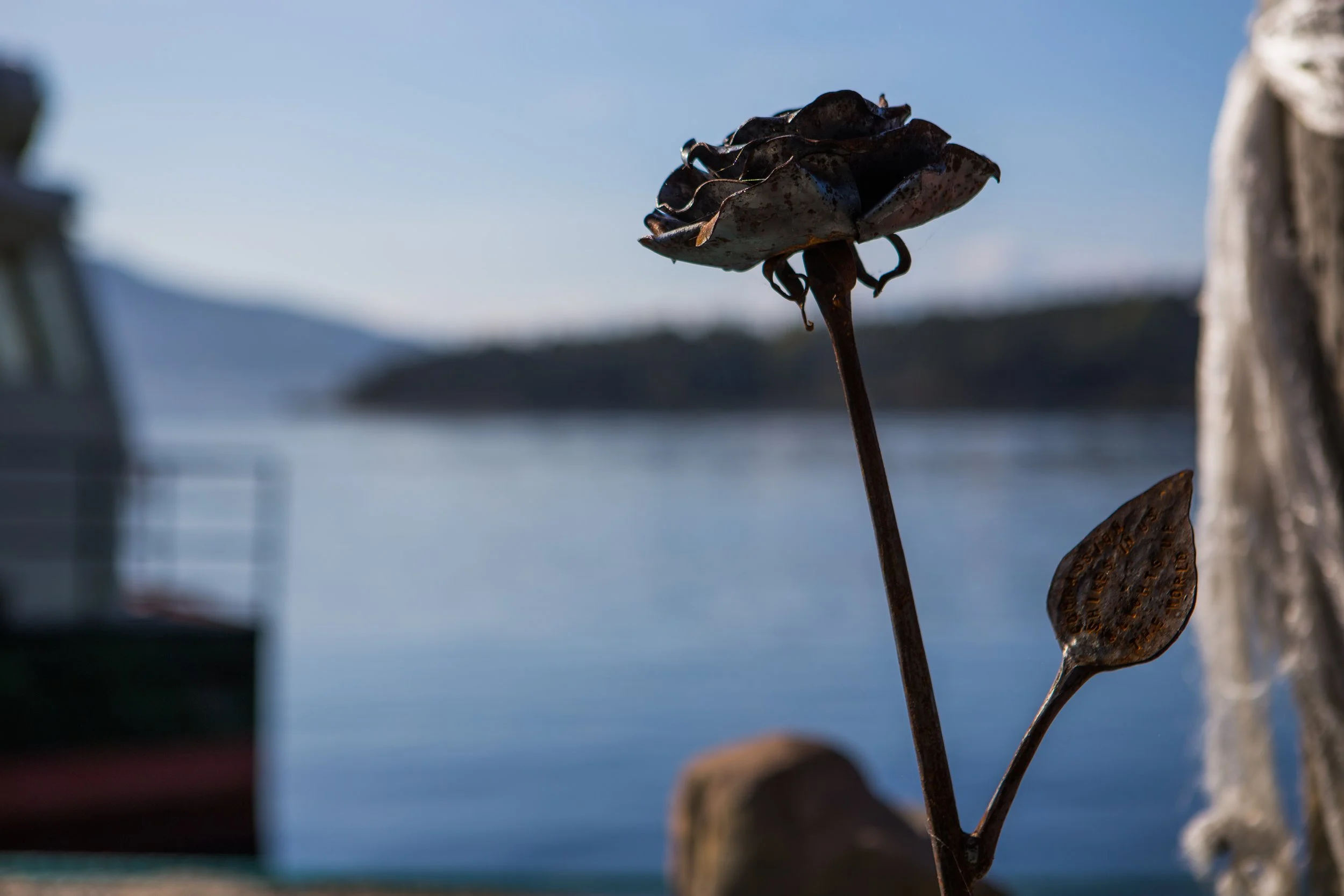 An iron rose by Utøya Island, Norway, where Anders Breivik in 2011 killed 69 in the second part of a two-stage terrorist attack that killed 77 people.